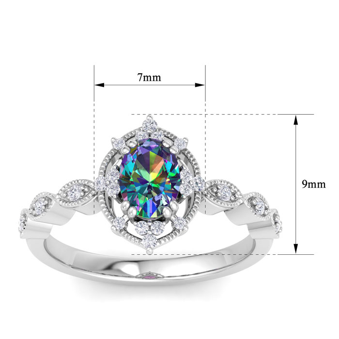 This mystic topaz ring features one 7x5mm oval shape mystic topaz gemstone at approximately 3/4 carats. There are 22 diamonds of I-J color, I1-I2 clarity at approximately 1/4 carats total. Total gem weight is approximately 1 carats. This ring is crafted in 14 karat white gold.