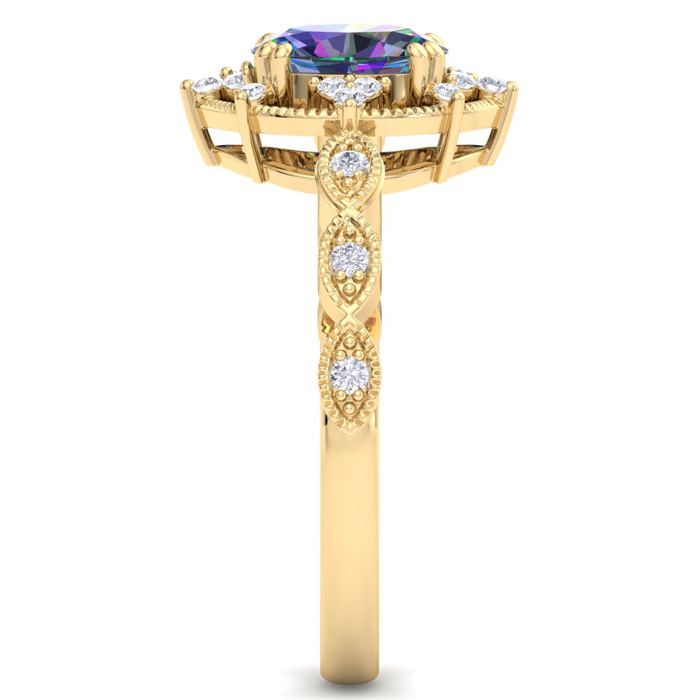 Retrograde Birthstones™ 1 Carat Round Shape Mystic Topaz Ring With Diamond Halo In 14 Karat Yellow Gold