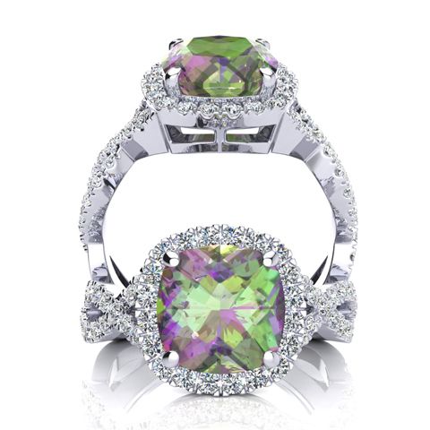 2-1/2 Carat Cushion Shape Mystic Topaz Ring With Diamond Halo In 14 Karat White Gold