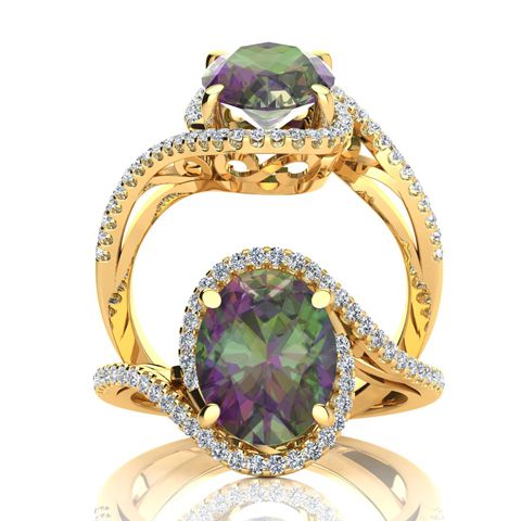 2-1/2 Carat Oval Shape Mystic Topaz Ring With Curving Diamond Halo In 14 Karat Yellow Gold