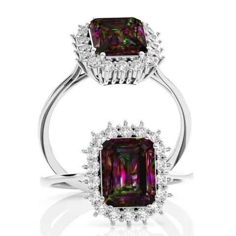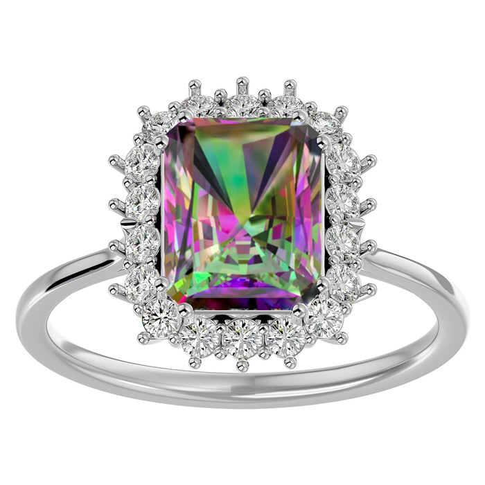 2-1/3 Carat Octagon Shape Mystic Topaz Ring With Diamond Halo In 14 Karat White Gold