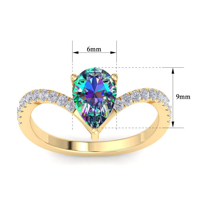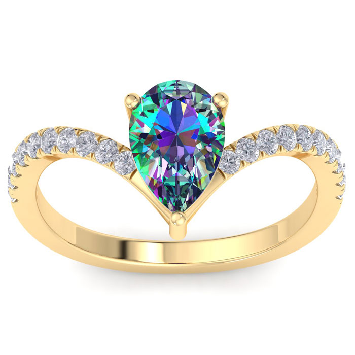 This mystic topaz ring features one 9x6mm pear shape mystic topaz gemstone at approximately 2 carats. There are 20 diamonds of I-J color, I1-I2 clarity at approximately 1/3 carats total. Total gem weight is approximately 2-1/3 carats. This ring is crafted in 14 karat yellow gold. *Retrograde Birthstones™ flips the idea of traditional birthstones. Wear your ½ birthday birthstone, your Retrograde Birthstone, “The Birthstone For Your Bad Side™.