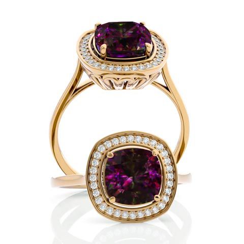 2-1/4 Carat Cushion Shape Mystic Topaz Ring With Diamond Halo In 14 Karat Yellow Gold