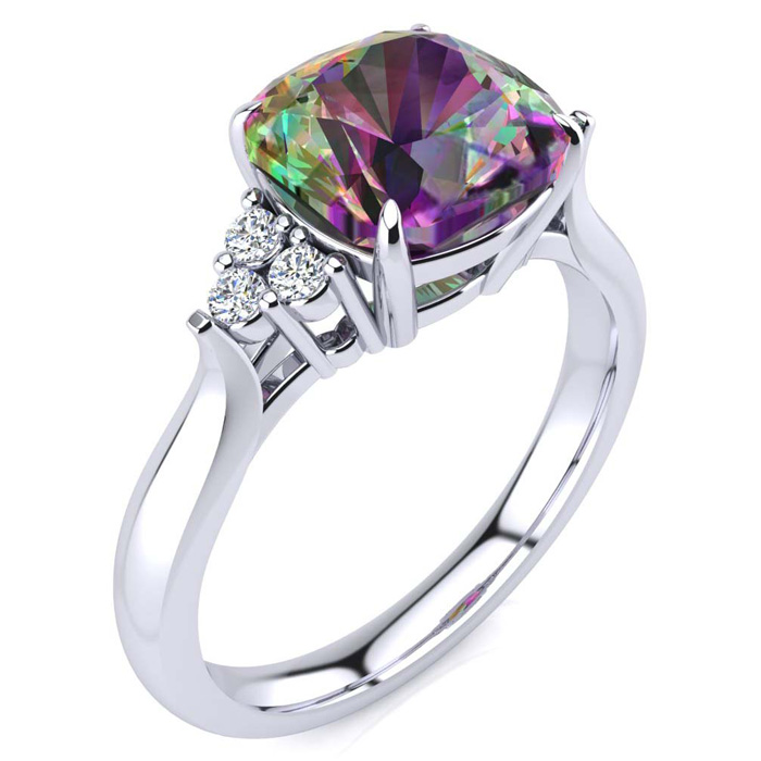 This mystic topaz ring features one 8x8mm cushion shape mystic topaz gemstone at approximately 2-1/10 carats. There are 6 diamonds of I-J color, I1-I2 clarity at approximately 1/10 carats total. Total gem weight is approximately 2-1/5 carats. This ring is crafted in 10 karat white gold.
