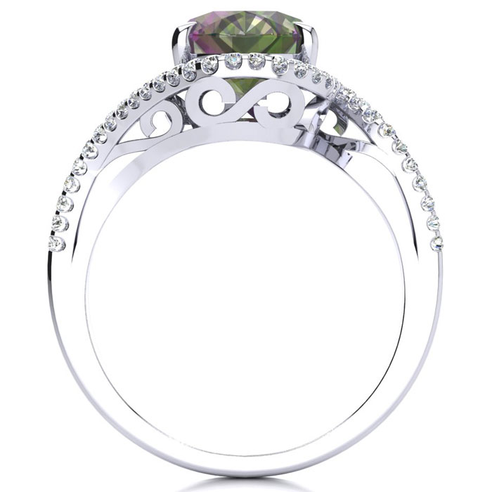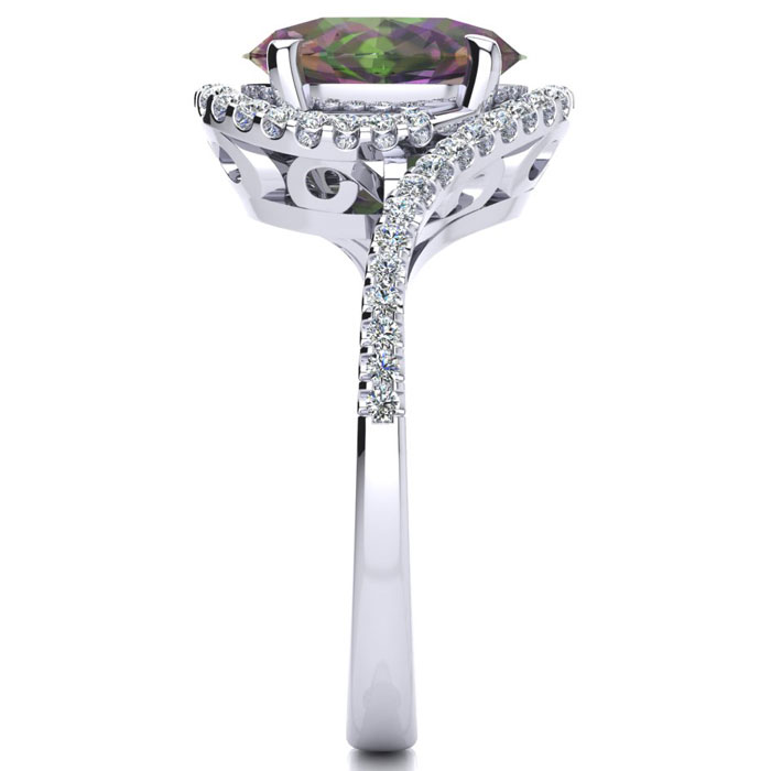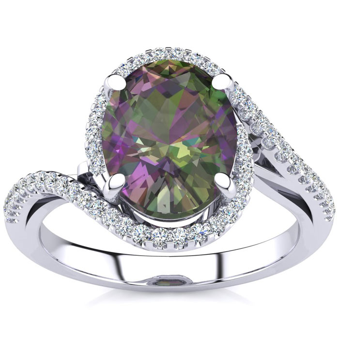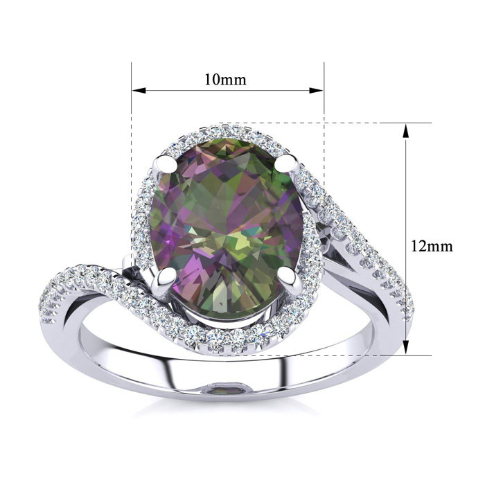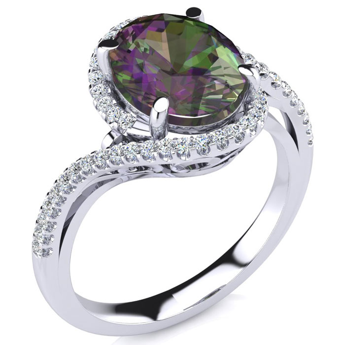 This mystic topaz ring features one 10x8mm oval shape mystic topaz gemstone. It is surrounded by 50 sparkling diamonds totaling 1/4 carat in I-J color, I1-I2 clarity. Total carat weight is approximately 2 3/4 carats. This ring is in sterling silver.