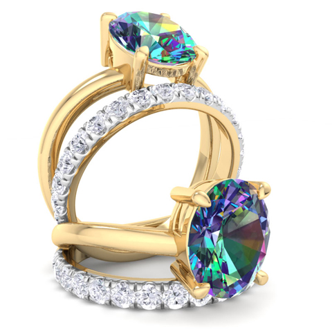 2-3/4 Carat Oval Shape Mystic Topaz Ring Plus Band With Diamond Halo In 14 Karat Yellow Gold