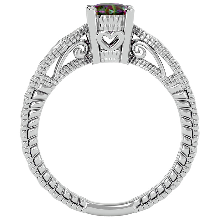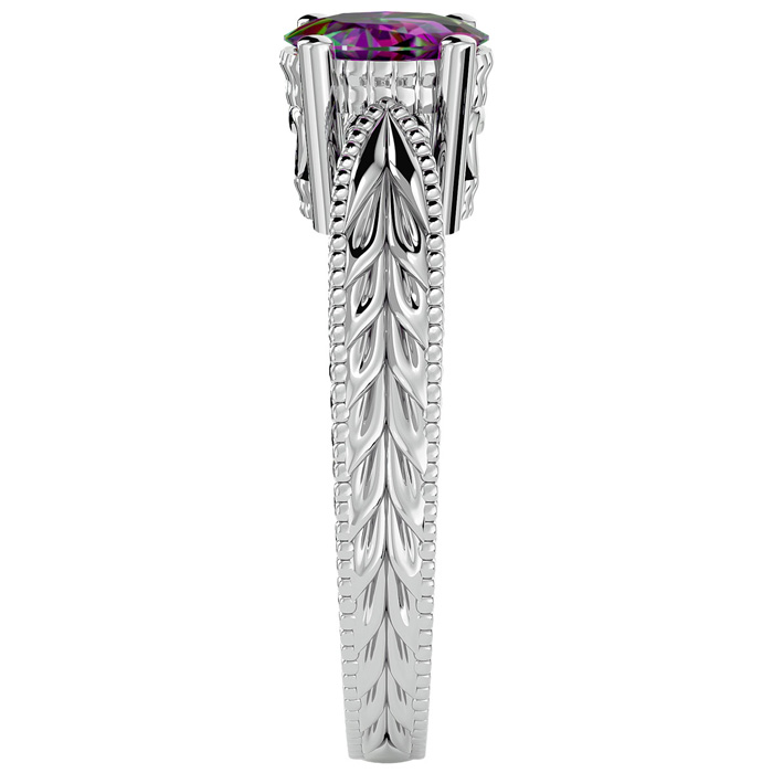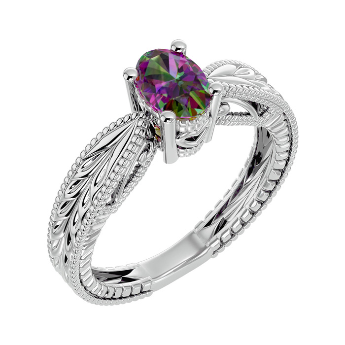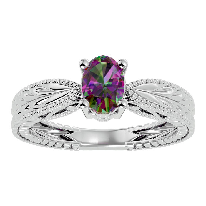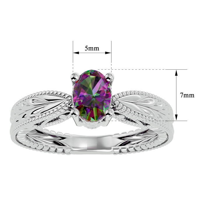 This mystic topaz ring features one 7x5mm oval shape mystic topaz gemstone at approximately 3/4 carats. This ring is crafted in 14 karat white gold.