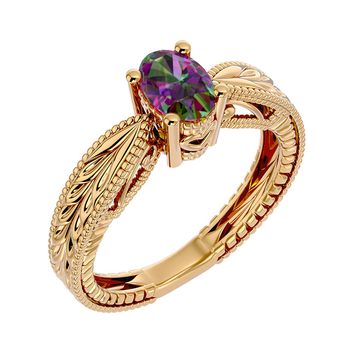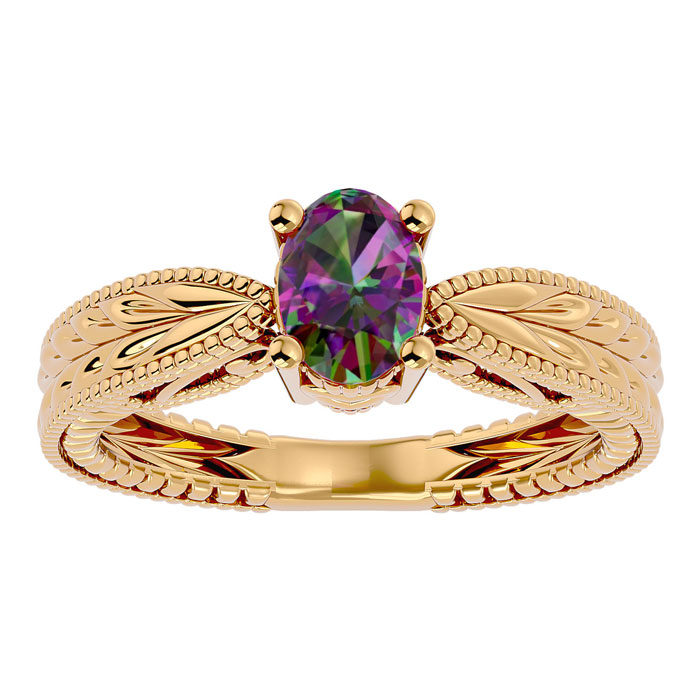 3/4 Carat Oval Shape Mystic Topaz Ring With Tapered Etched Band In 14 Karat Yellow Gold