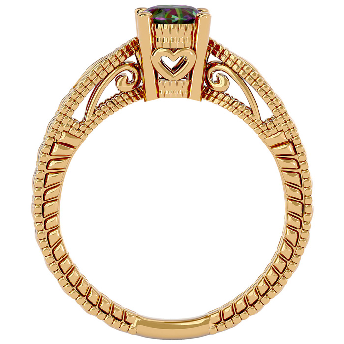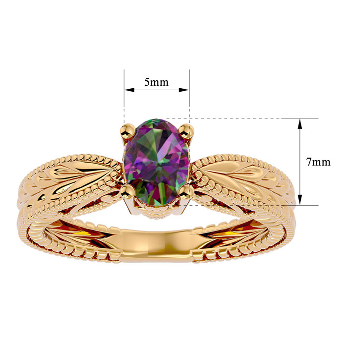 This mystic topaz ring features one 7x5mm oval shape mystic topaz gemstone at approximately 3/4 carats. This ring is crafted in 14 karat yellow gold.