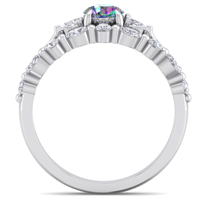 This mystic topaz ring features one 5mm round shape mystic topaz gemstone at approximately 3/8 carats. There are 11 diamonds (5 round, 4 marquise, 2 pear shape) of I-J color, I1-I2 clarity at approximately 1/3 carats total. Total gem weight is approximately 3/4 carats. This ring is crafted in 14 karat white gold.