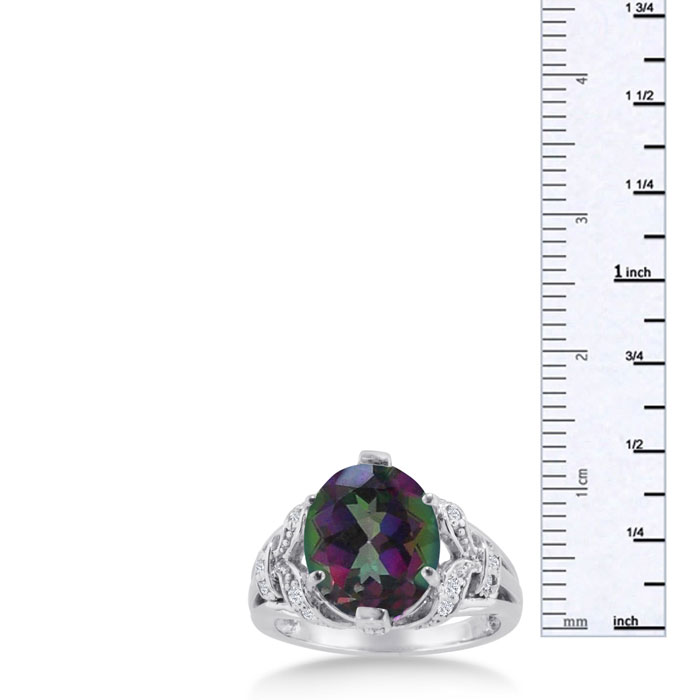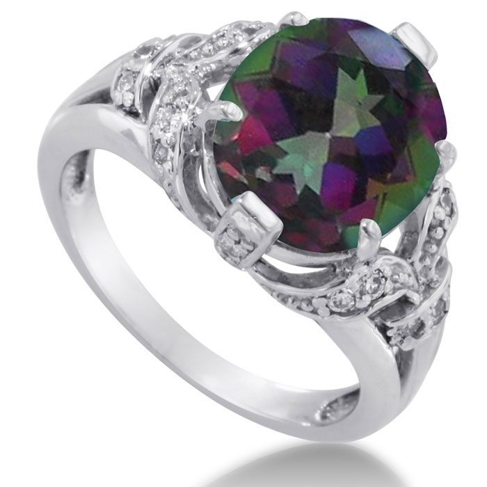 I love the band this mystic topaz diamond ring comes with; it is so elegant and antique looking. The diamonds on the side sparkle and look so nice with the mysterious iridescent stone. This large gem stone jewelry is very trendy right now; get this fabulous ring now while they last.