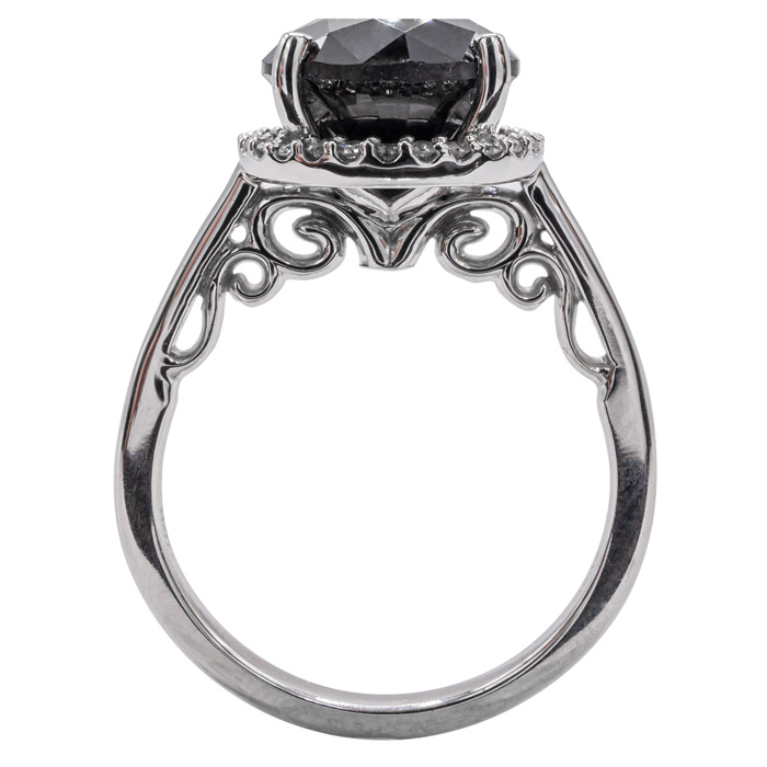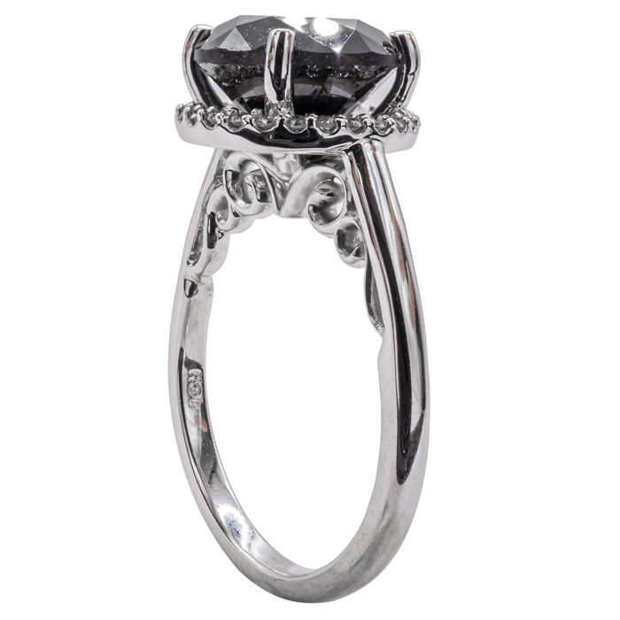 This amazing engagement ring features a 4.42 carat center black diamond in I3 clarity. It is surrounded by 59 sparkling diamonds in a halo in G-H color, I1 clarity at approximately 0.13 carats. Total carat weight is approximately 4 1/2 carats. This ring is in 14 karat white gold.