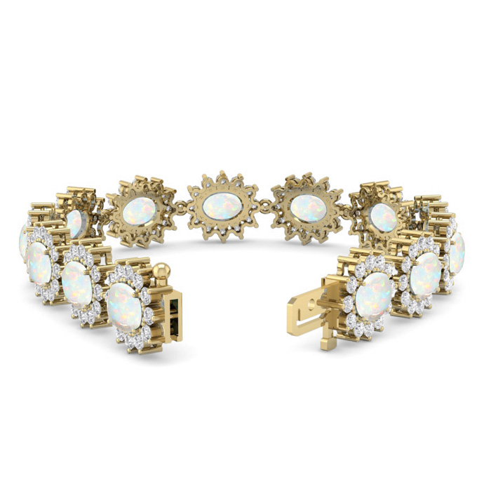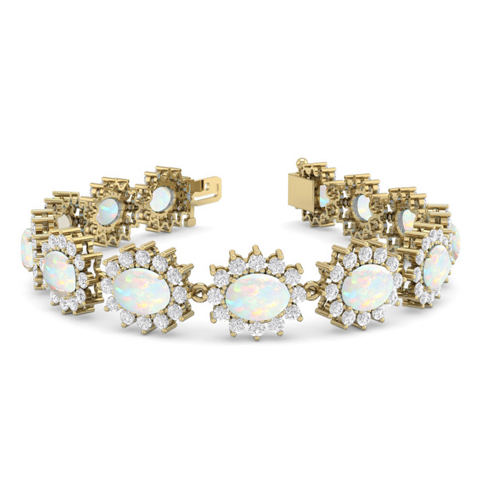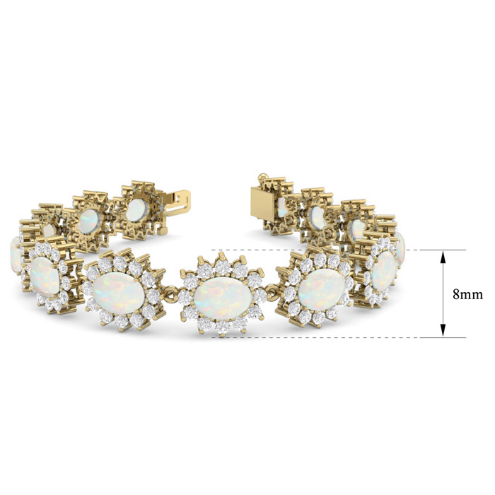 This opal bracelet features 13 oval shape 8x6mm opal gemstones totaling approximately 9 3/4 carats. There are 156 round shape diamonds in I-J color, I2 clarity totaling approximately 4 1/2 carats. Total carat weight is 14 1/4 carats. This opal bracelet is in 14 karat yellow gold and is 7 inches long. It comes with a secure box with tongue and safety clasp.