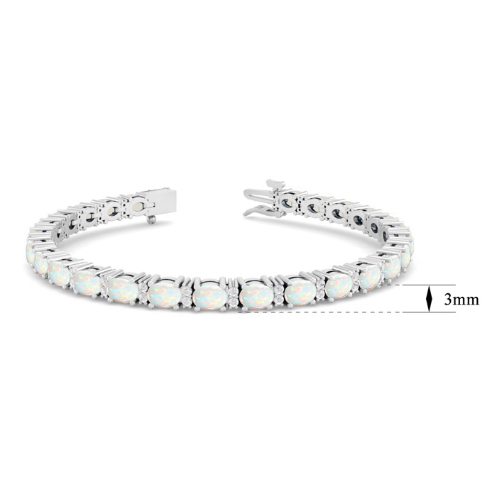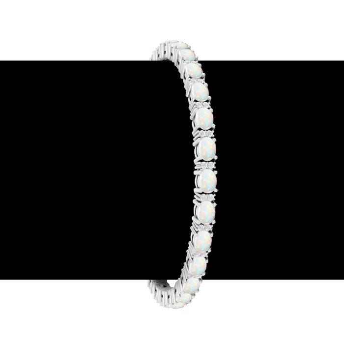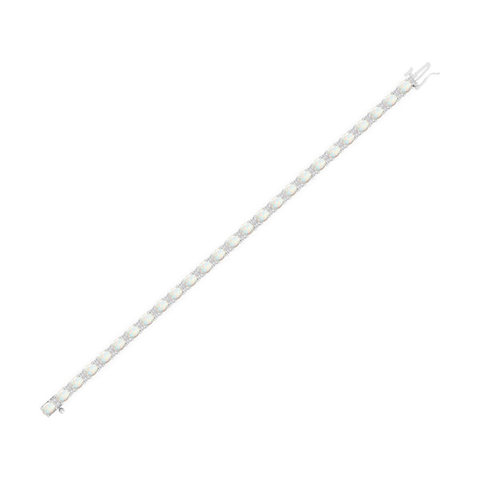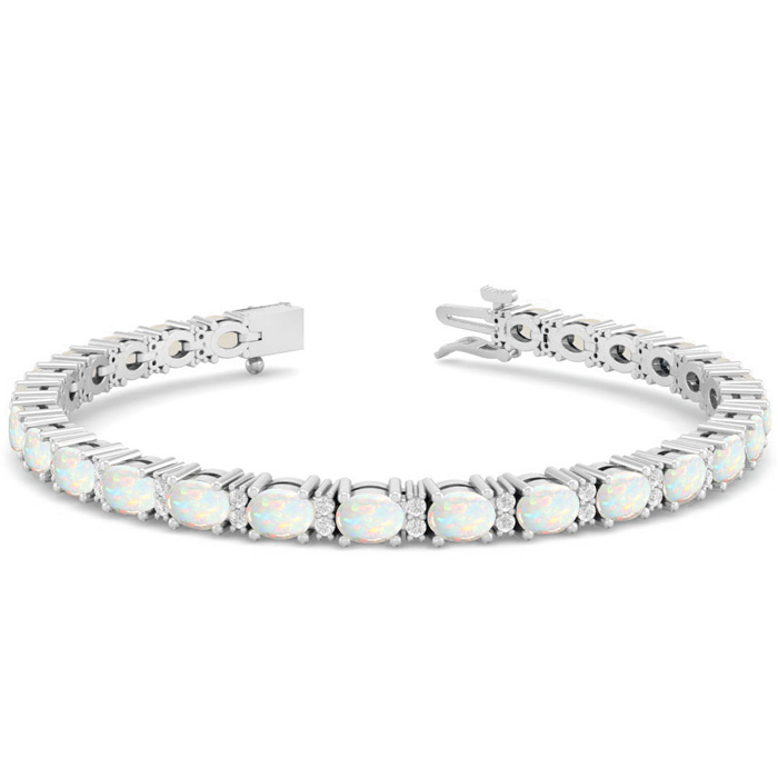 This opal bracelet features 26 oval shape 4x3mm opal gemstones totaling approximately 4 carats. There are 52 round shape diamonds in I-J color, I2 clarity totaling approximately 1/2 carat. Total carat weight is 4 1/2 carats. This opal bracelet is in 14 karat white gold and is 7 inches long. It comes with a secure box with tongue and safety clasp.