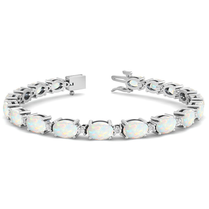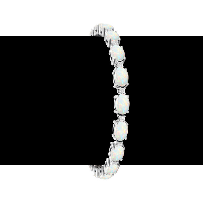 This opal bracelet features 19 oval shape 6x4mm opal gemstones totaling approximately 5 3/4 carats. There are 19 round shape diamonds in I-J color, I2 clarity totaling approximately 0.40 carats. Total carat weight is 6 carats. This opal bracelet is in 14 karat white gold and is 7 inches long. It comes with a secure box with tongue and safety clasp.