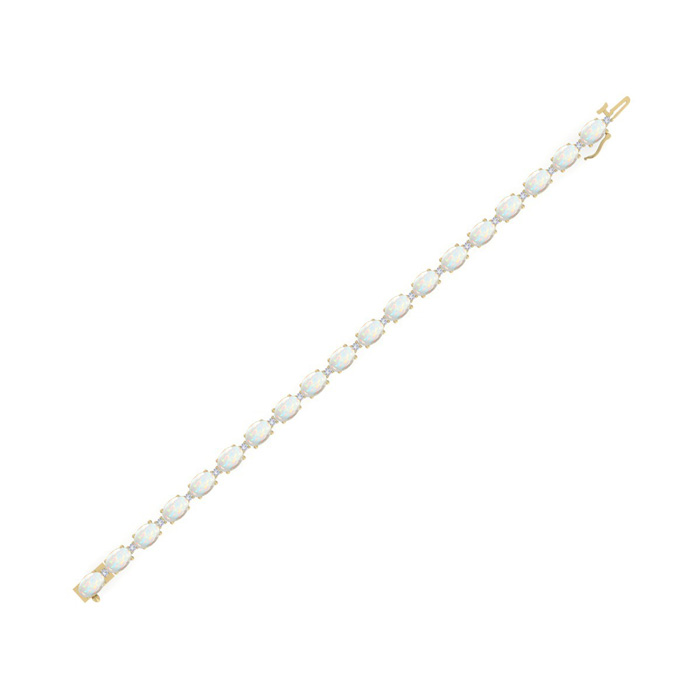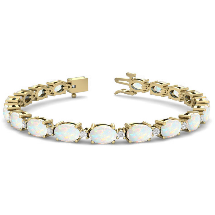 This opal bracelet features 19 oval shape 6x4mm opal gemstones totaling approximately 5 3/4 carats. There are 19 round shape diamonds in I-J color, I2 clarity totaling approximately 0.40 carats. Total carat weight is 6 carats. This opal bracelet is in 14 karat yellow gold and is 7 inches long. It comes with a secure box with tongue and safety clasp.