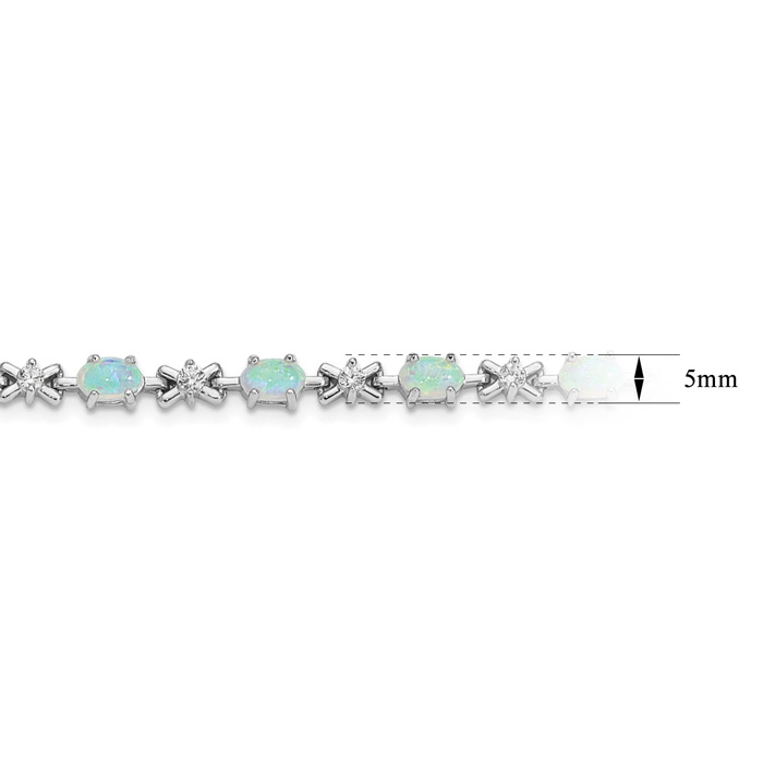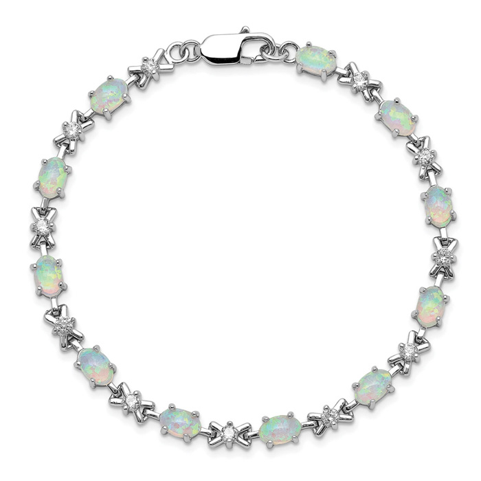 This opal bracelet features created opal gemstones accented with cubic zirconias. This opal bracelet is in sterling silver and is 7 inches long with a lobster claw clasp.