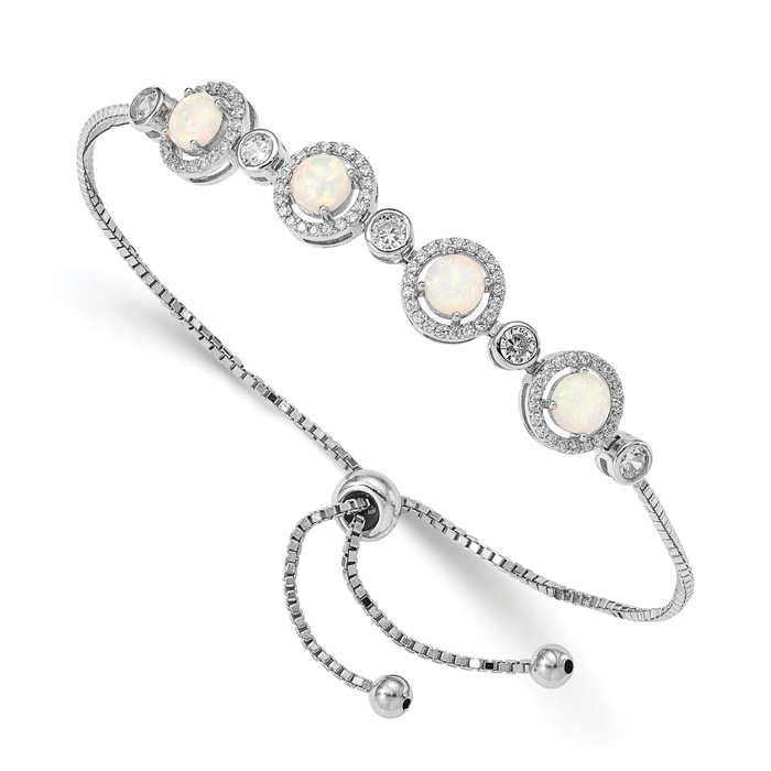 This opal bracelet features four created opal gemstones with cubic zirconia accents. This opal bracelet is in sterling silver and adjusts from 7-10 inches.