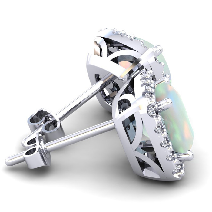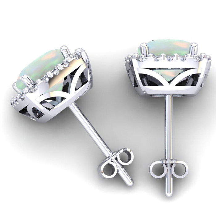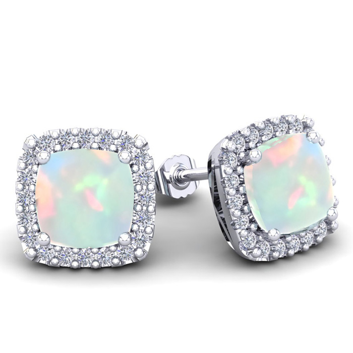 These stunning opal earrings features two 6x6mm cushion shape created opal gemstones each weighing approximately 1 carat. It is surrounded by 44 sparkling diamonds in I-J color, I1-I2 clarity at 1/4 carat. Total carat weight is 2 1/4 carats. These earrings are crafted in sterling silver and have comfortable and secure post with friction backs.
