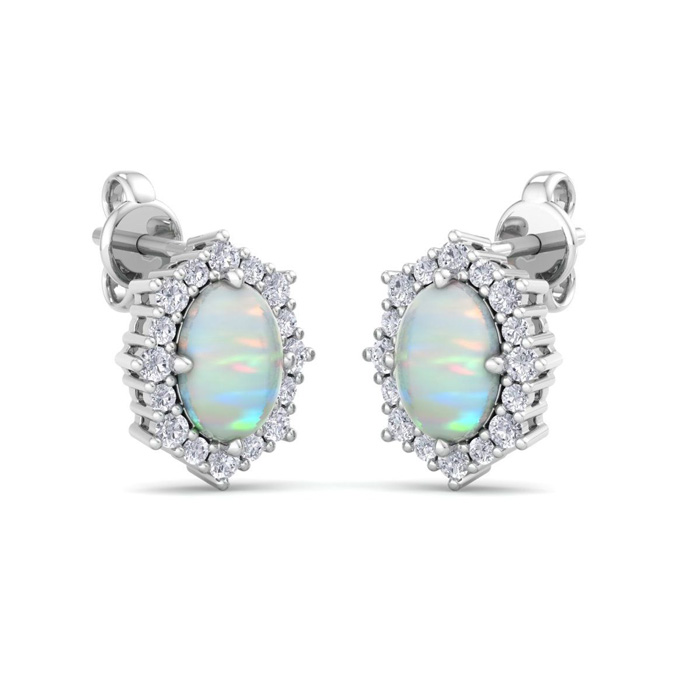 2 Carat Oval Shape Opal and Diamond Earrings In 14K White Gold