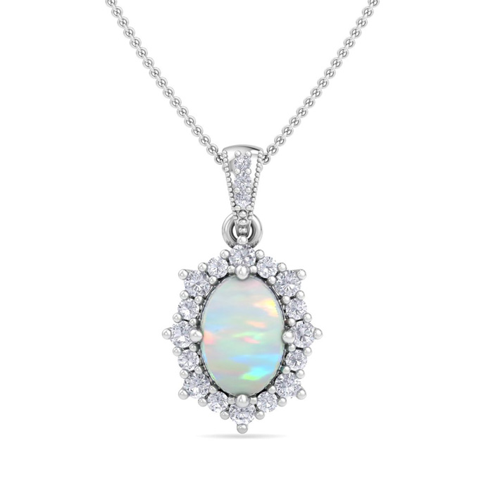 Retrograde Birthstones™ 1-1/3 Carat Oval Shape Opal and Diamond Necklace In 14K White Gold