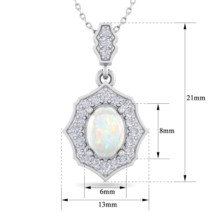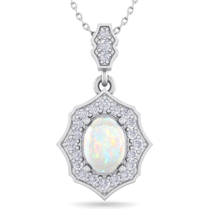 This opal necklace features one 8x6mm oval shape opal gemstone at approximately 1 carats. It is surrounded by 23 sparkling diamonds in I-J color, I1-I2 clarity at 1/4 carat total weight. Total gem weight is approximately 1-1/4 carat total weight. This necklace is in 14 karat white gold and comes with an 18 inch cable chain with a spring ring clasp. The pendant is approximately 3/4 inch long.