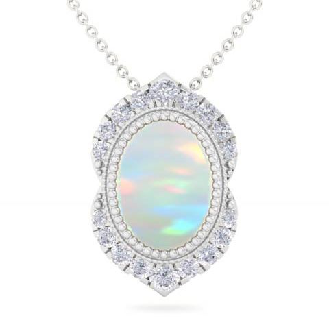 1-1/5 Carat Oval Shape Opal and Diamond Necklace In 14K White Gold
