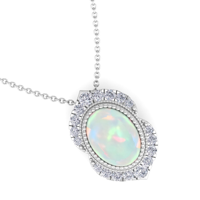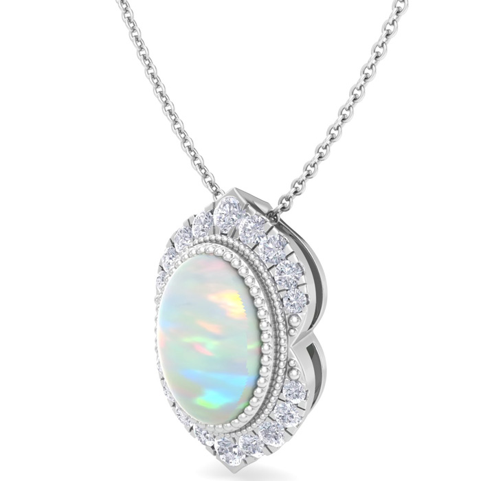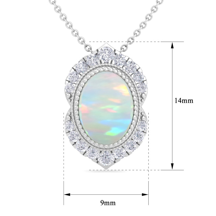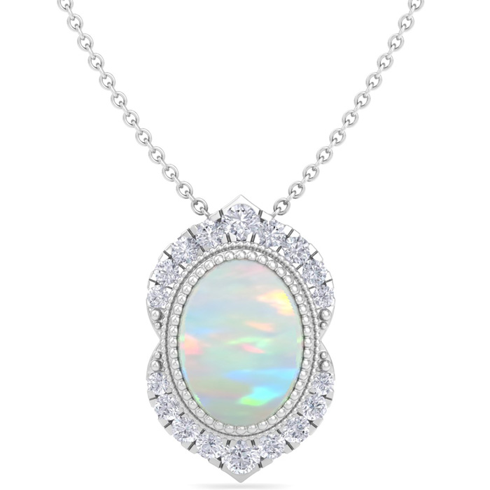 Retrograde Birthstones™ 1-1/5 Carat Oval Shape Opal and Diamond Necklace In 14K White Gold