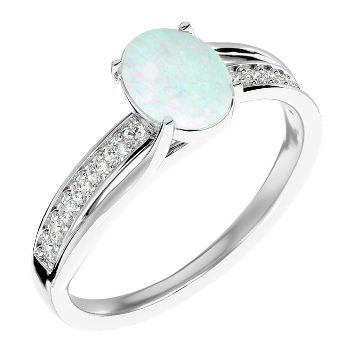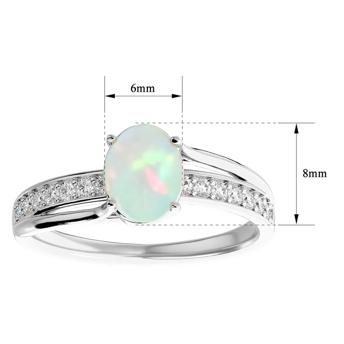 This opal ring features one 8x6mm oval shape created opal gemstone. It is surrounded by 14 sparkling diamonds totaling 1/5 carat in I-J color, I1-I2 clarity. Total carat weight is approximately 1 1/2 carats. This ring is in sterling silver.