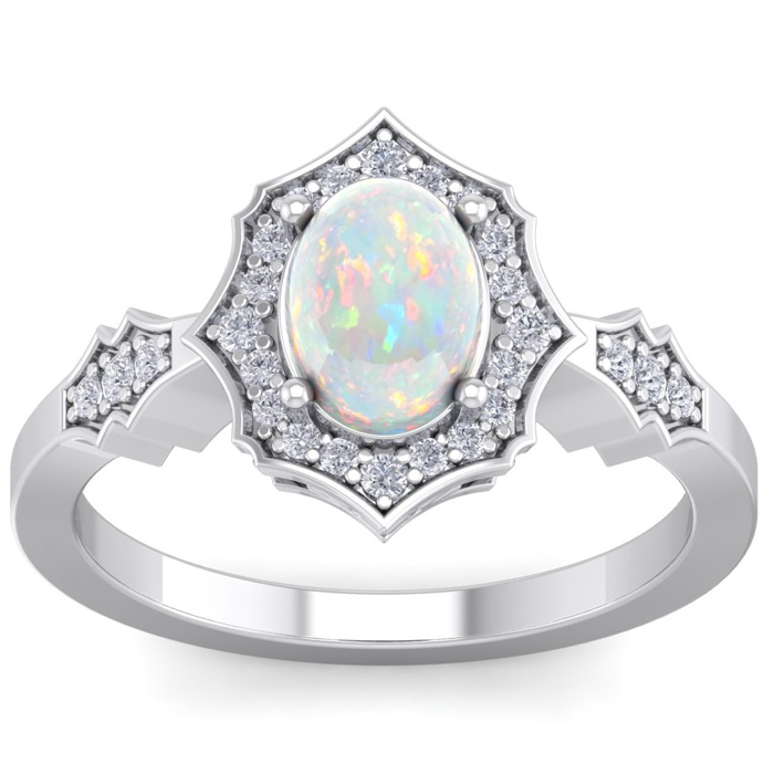 This opal ring features one 8x6mm oval shape created opal gemstone. It is surrounded by 26 sparkling diamonds totaling 1/4 carat in I-J color, I1-I2 clarity. Total carat weight is approximately 1 1/2 carats. This ring is in sterling silver.