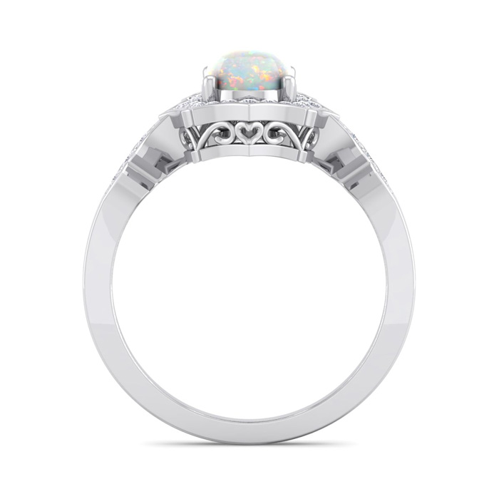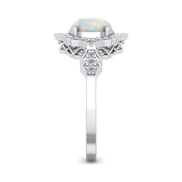 This opal ring features one 8x6mm oval shape created opal gemstone. It is surrounded by 26 sparkling diamonds totaling 1/4 carat in I-J color, I1-I2 clarity. Total carat weight is approximately 1 1/2 carats. This ring is in sterling silver. *Retrograde Birthstones™ flips the idea of traditional birthstones. Wear your ½ birthday birthstone, your Retrograde Birthstone, “The Birthstone For Your Bad Side™.