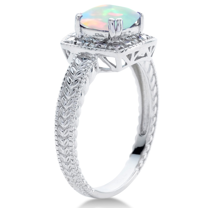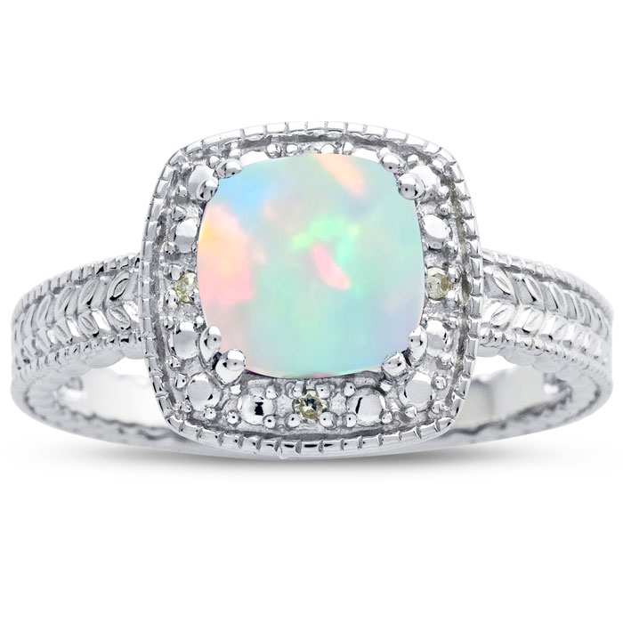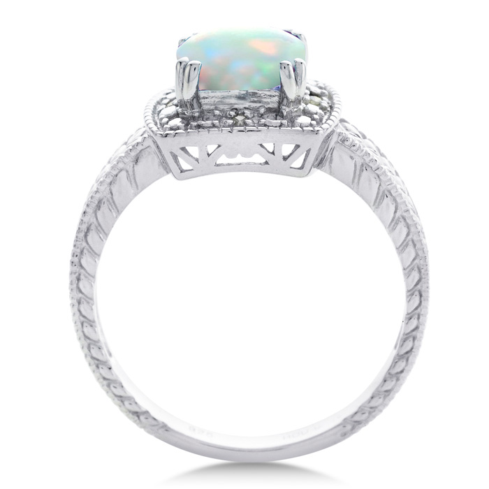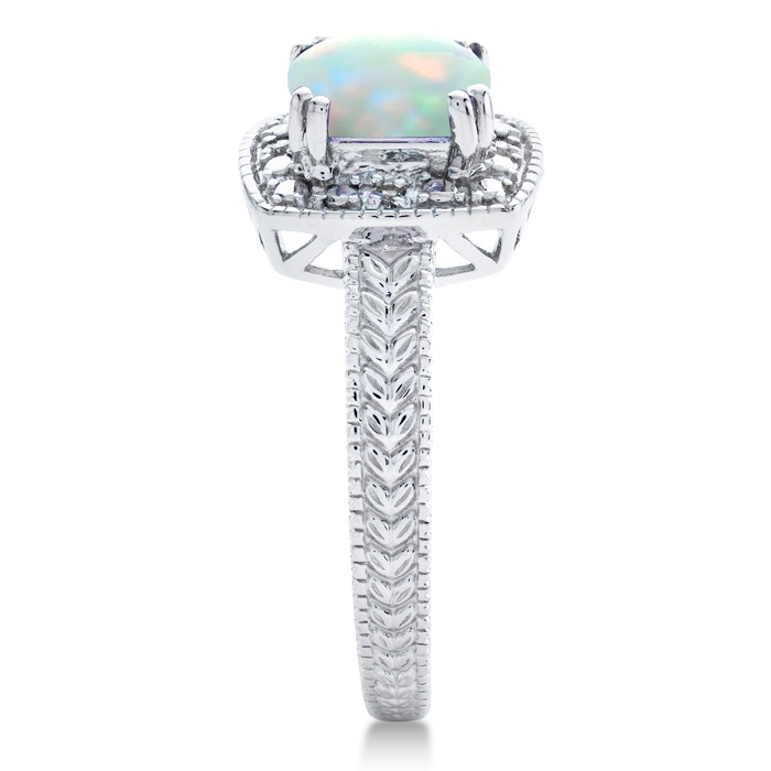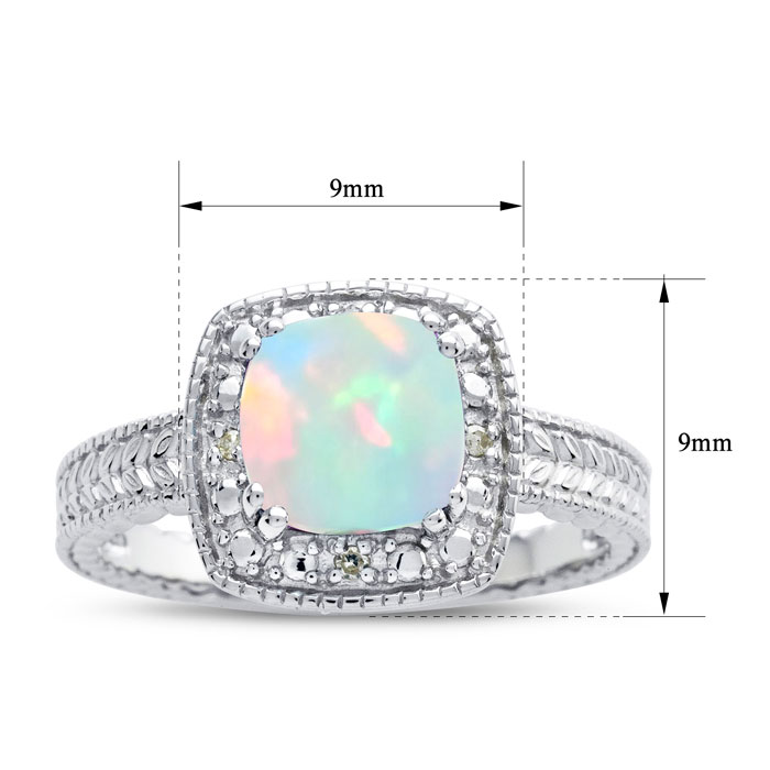 This opal ring features one 7x7mm cushion shape created opal gemstone. It is surrounded by 4 sparkling diamonds totaling 0.02 carats in I-J color, I1-I2 clarity. Total carat weight is approximately 1 1/4 carats. This ring is in sterling silver.