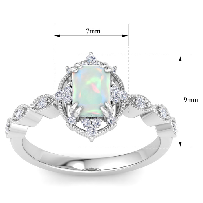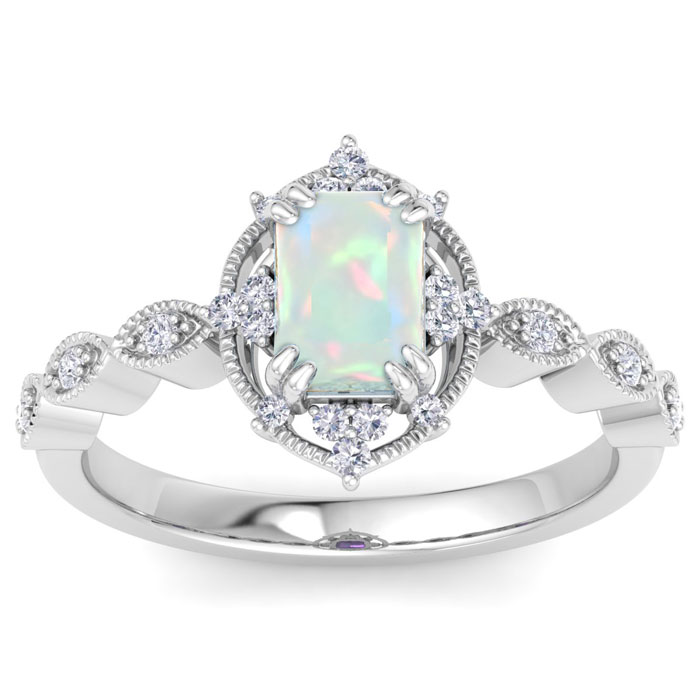 This gemstone ring features one 7x5mm octagon shape opal gemstone weighing approximately 3/4 carat. There are 22 sparkling round diamonds in I-J color, I1-I2 clarity totaling approximately 1/4 carat. Total carat weight is 1 carat. This ring is in 14 karat white gold.