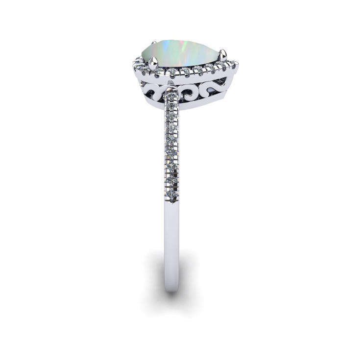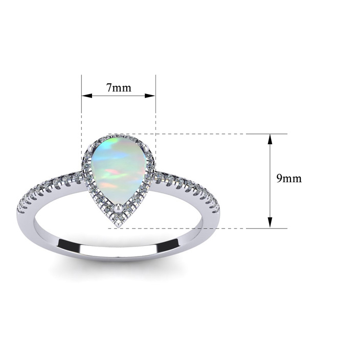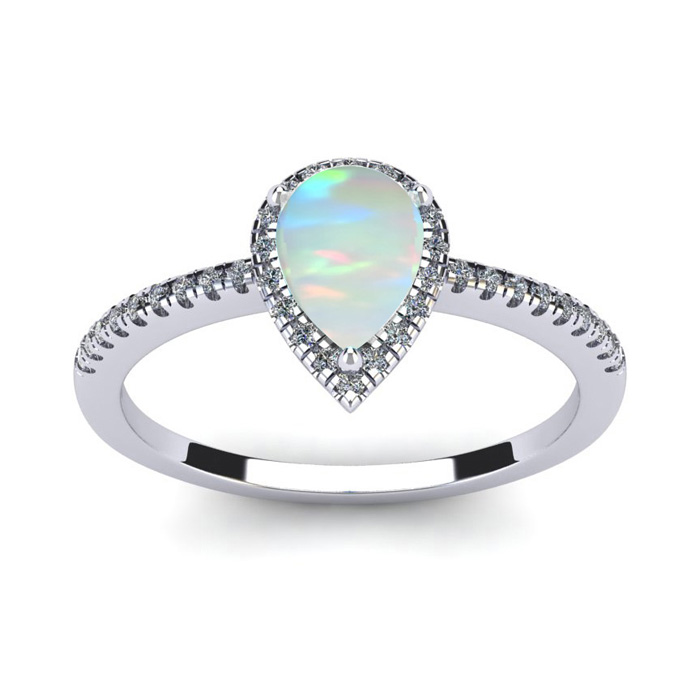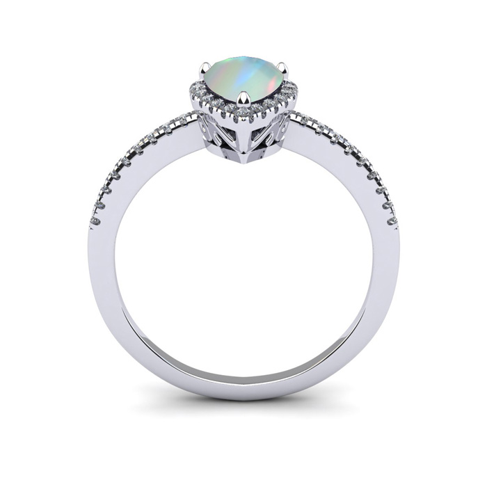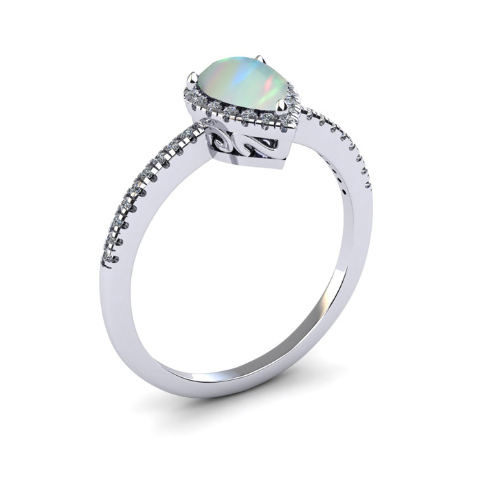 This opal ring features one 7x5mm pear shape created opal gemstone. It is surrounded by 36 sparkling diamonds totaling 1/5 carat in I-J color, I1-I2 clarity. Total carat weight is approximately 1 carat. This ring is in sterling silver.