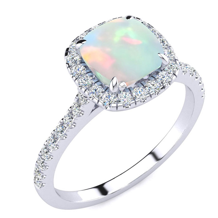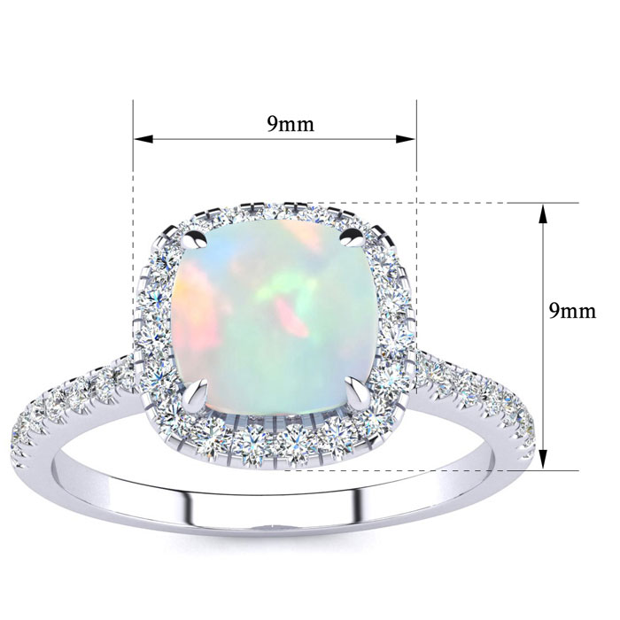 This opal ring features one 7mm cushion cut created opal gemstone. It is surrounded by 38 sparkling diamonds totaling 1/2 carat in I-J color, I1-I2 clarity. Total carat weight is approximately 2 carats. This ring is in sterling silver.