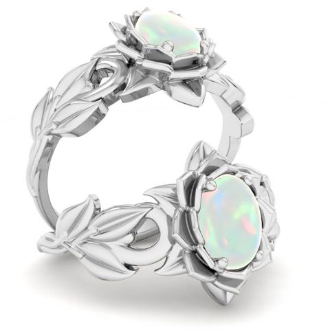 3/4 Carat Oval Shape Opal Ring with Floral Design In 14K White Gold