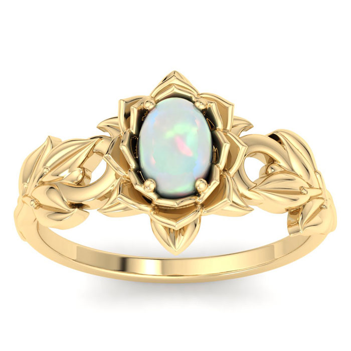 Retrograde Birthstones™ 3/4 Carat Oval Shape Opal Ring with Floral Design In 14K Yellow Gold