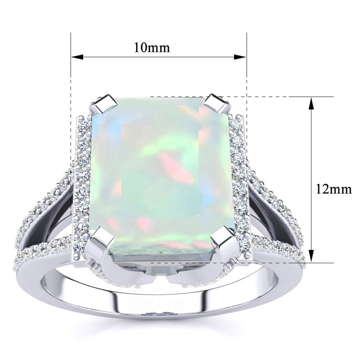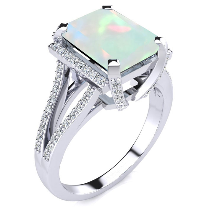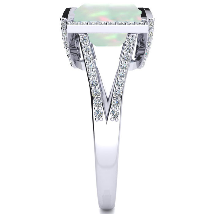 This opal ring features one 10x8mm emerald shape created opal gemstone. It is surrounded by 72 sparkling diamonds totaling 1/2 carat in I-J color, I1-I2 clarity. Total carat weight is approximately 4 carats. This ring is in sterling silver.