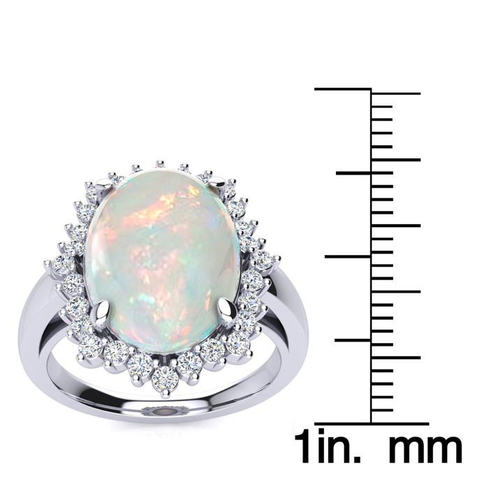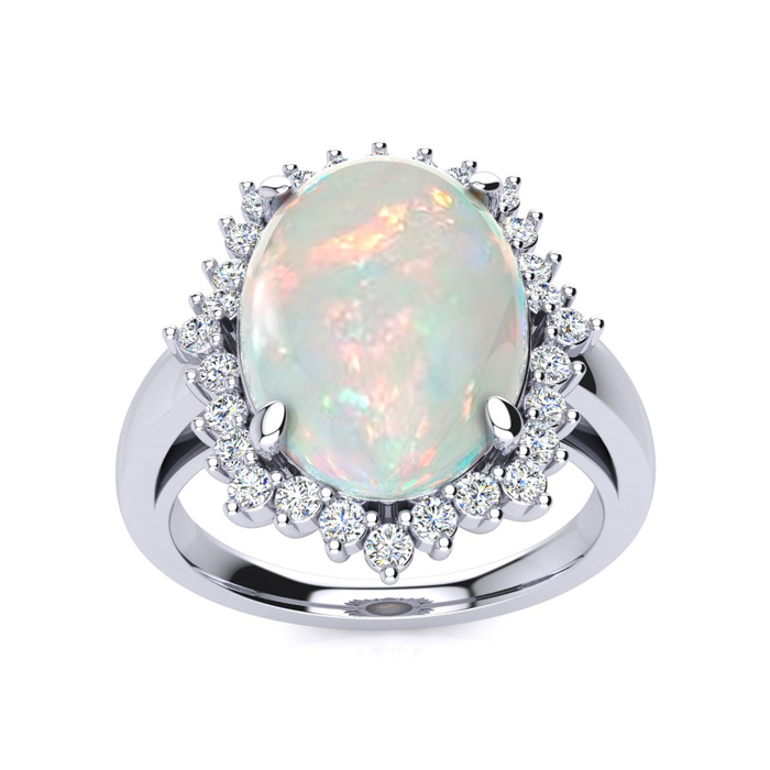 This classic opal ring features a 3-1/2 carat oval shape opal gemstone. It is surrounded by 28 diamonds in a ballerina style in I-J color, SI2-I1 clarity. Total diamond weight is 0.42 carats. This ring is crafted in 14 karat white gold. Total gem weight is 3.92 carats. Ring top measures approximately 18x14mm.