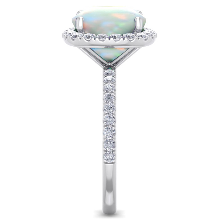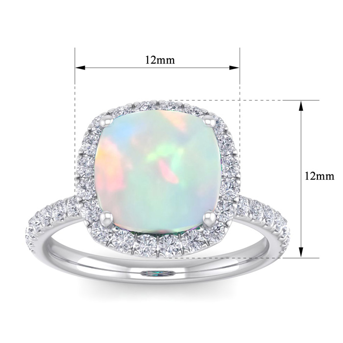 This opal ring features one 10mm cushion cut created opal gemstone. It is surrounded by 38 sparkling diamonds totaling 1/2 carat in I-J color, I1-I2 clarity. Total carat weight is approximately 5 1/2 carats. This ring is in sterling silver.