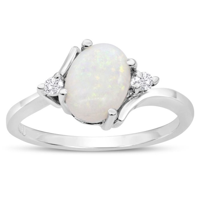 This opal ring features one 8x6mm oval shape opal gemstone. It is approximately 7/8 carats. It is surrounded by 2 sparkling diamonds at 0.04 carats. Diamond color is I-J, diamond clarity is I1-I2. Total carat weight is 0.84 carats. This ring is in 14 karat white gold.