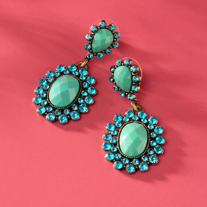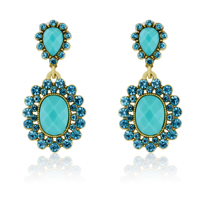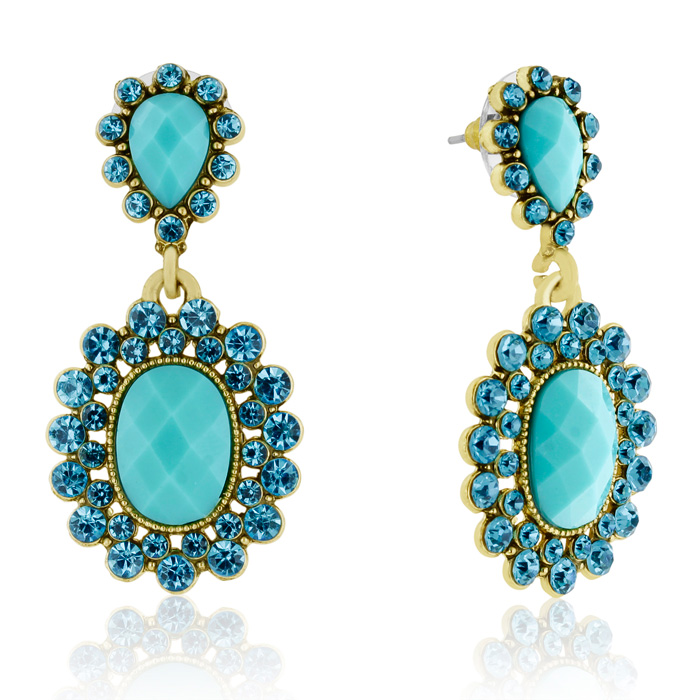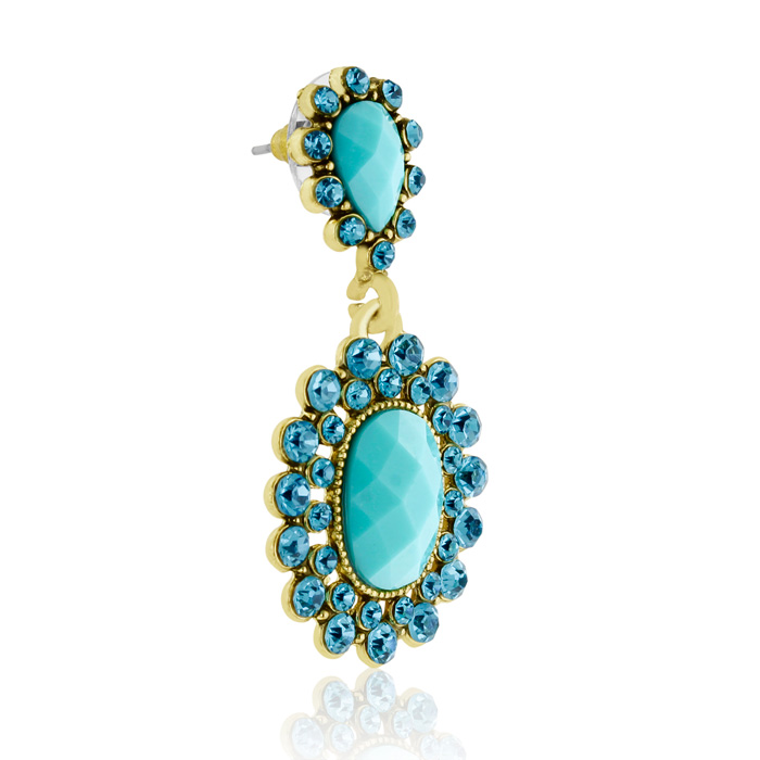 Passiana Summer Crystal Earrings, Turquoise. Earrings are composed of glass crystals and made up of 18 karat yellow gold over brass. Earrings measure 1 3/4" and have friction backs.