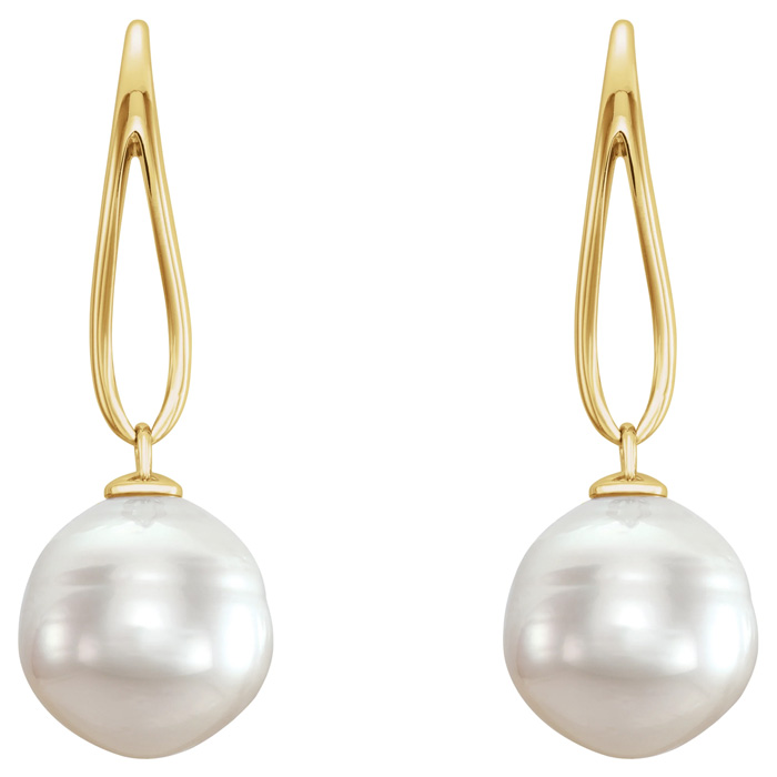 These pearl drop earrings feature two 12mm freshwater cultured pearls adorning a wire. These earrings are in 14 karat yellow gold and have fishhook backs.