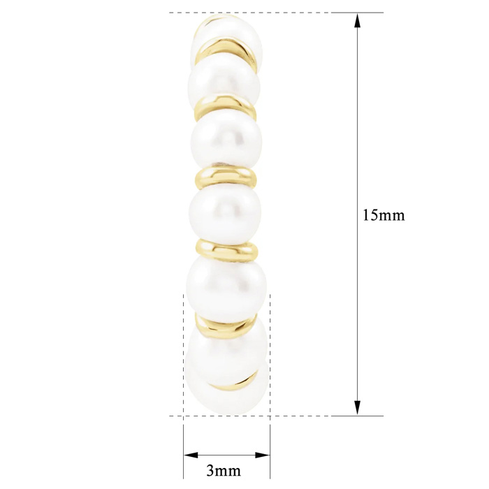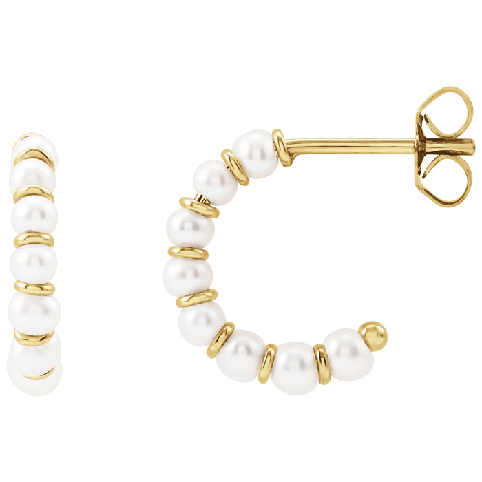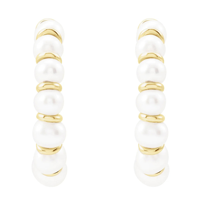 These pearl drop earrings feature 16 3mm freshwater cultured pearls adorning a hoop. These earrings are in 14 karat yellow gold and have post with friction backs.