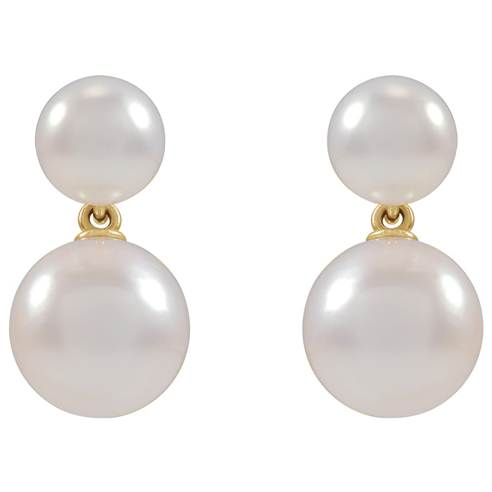 These pearl drop earrings feature two 4mm and two 6mm akoya pearls in a stud earring. These earrings are in 14 karat yellow gold and have post with friction backs.