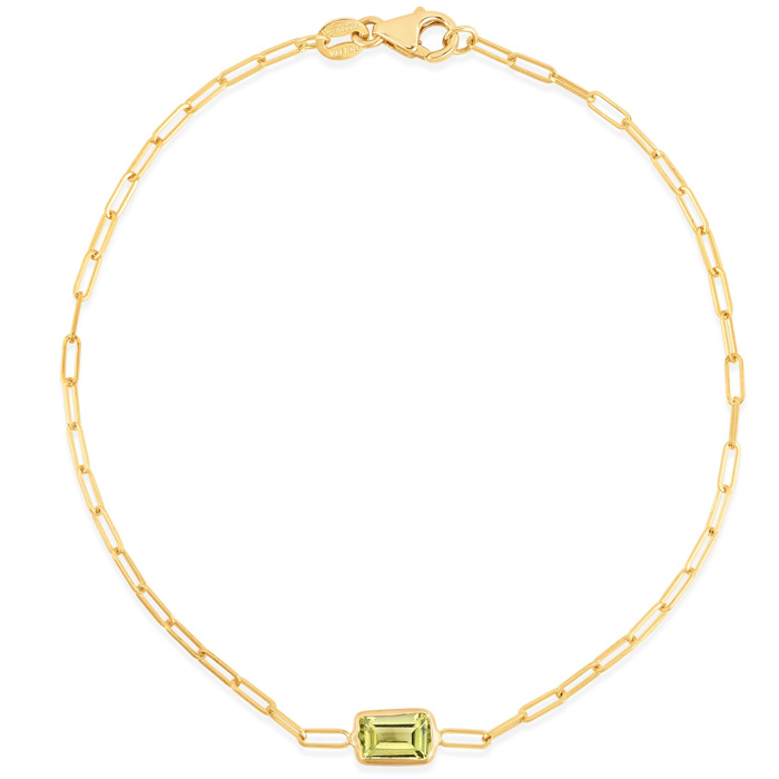 This peridot bracelet features one 6x4mm baguette peridot gemstone. The bracelet is a 7 inch 1.5mm paperclip chain with a lobster-claw clasp.