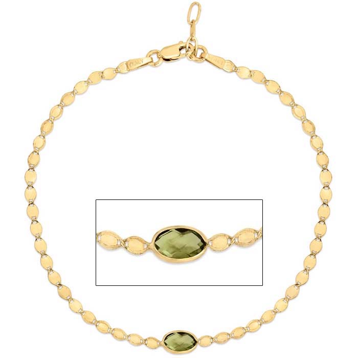 This peridot bracelet features one 6x4mm oval shape peridot gemstone. The bracelet is a 7.25" 2.2mm mirrored chain with a lobster-claw clasp.