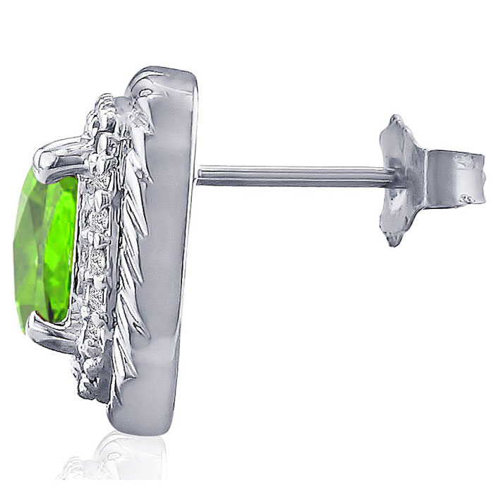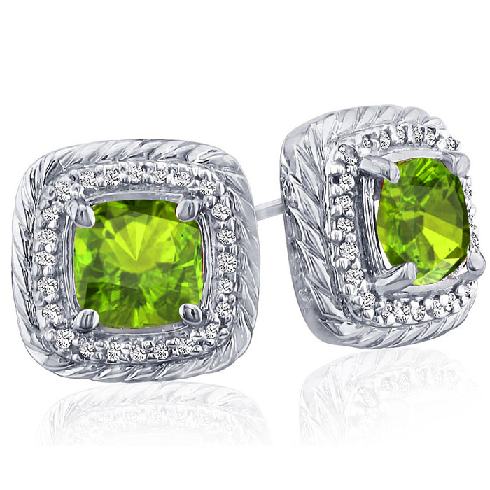 These stunning peridot earrings features two 7x7mm cushion shape peridot gemstones each weighing approximately 1 1/4 carats. It is surrounded by 48 sparkling diamonds in I-J color, I1-I2 clarity at 1/4 carat. Total carat weight is 2 3/4 carats. These earrings are crafted in sterling silver and have comfortable and secure post with friction backs.