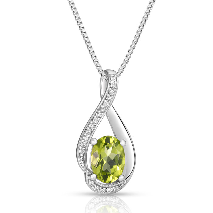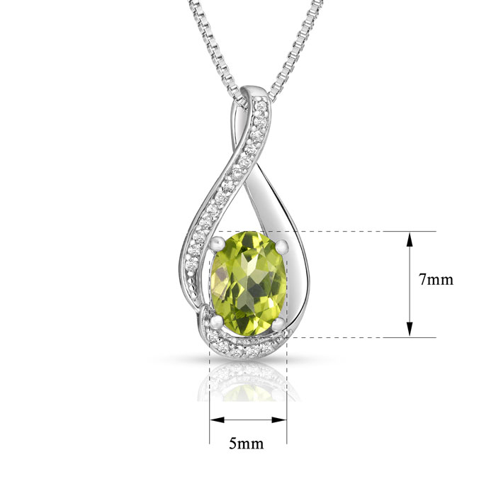 This stunning peridot necklace features one 7x5mm oval shape peridot gemstone weighing approximately 1 carat. It is surrounded by 18 sparkling diamonds in H-I color, I2-I3 clarity at 0.08 carats. Total carat weight is approximately 1.08 carats. This necklace is crafted in sterling silver and comes with an 18 inch box chain with spring ring clasp.