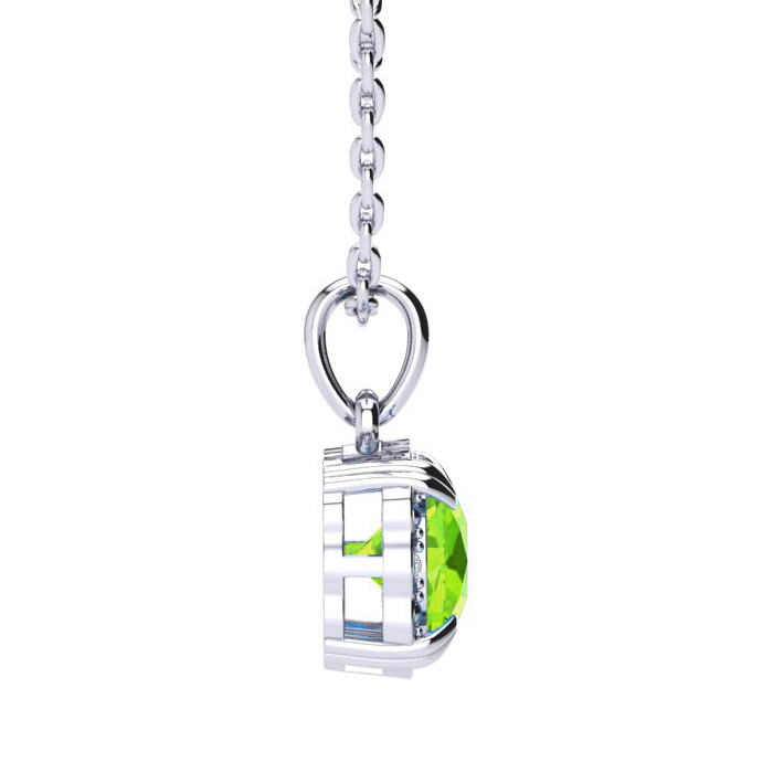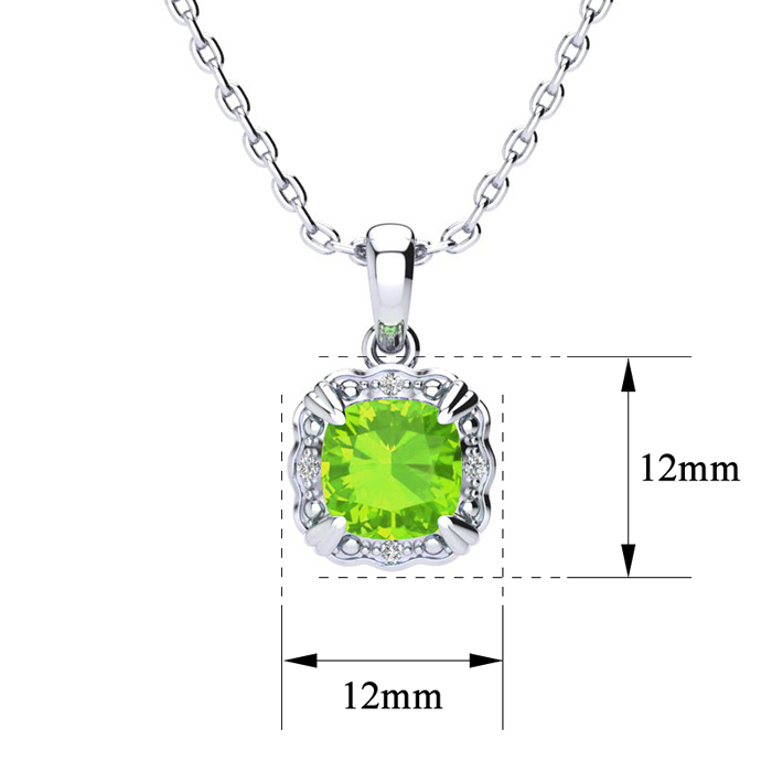 This stunning peridot necklace features one 8x8mm cushion shape peridot gemstone weighing approximately 2 carats. It is surrounded by 4 sparkling diamonds in I-J color, I1-I2 clarity at 0.04 carats. This necklace is crafted in sterling silver and comes with an 18 inch cable chain with spring ring clasp.